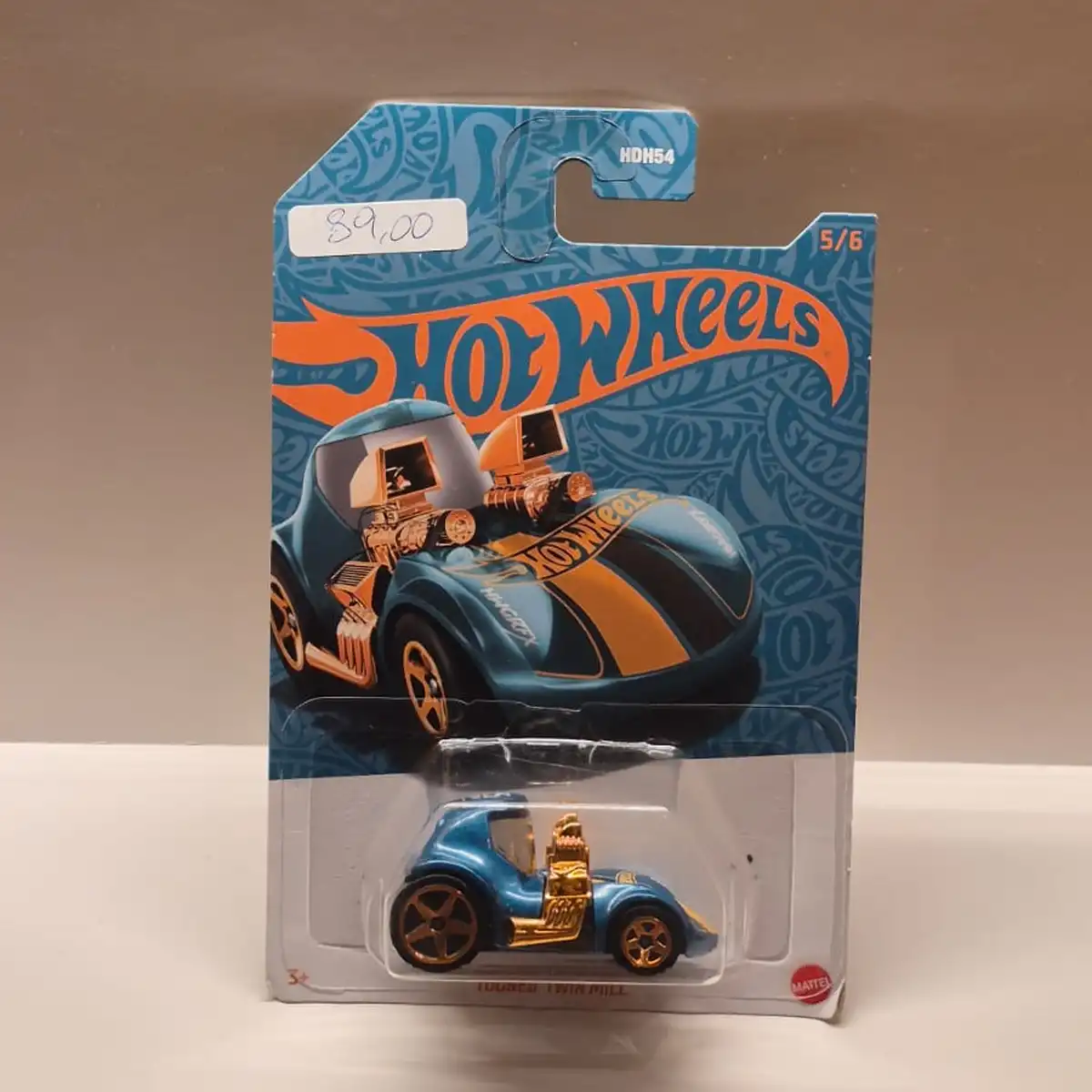 Da linha Tooned, o clássico conceito da Hot Wheels Twin Mill aparece em versão “caricata”: proporções exageradas, cockpit curto e os dois motores V8 à mostra. Este exemplar vem em azul metálico com detalhes dourados, faixas no capô e rodas com aro dourado. Miniatura 1:64 com construção die-cast padrão Hot Wheels e card ilustrado da série 5/6 — divertida para completar coleções temáticas e para fãs do ícone criado pela própria HW.