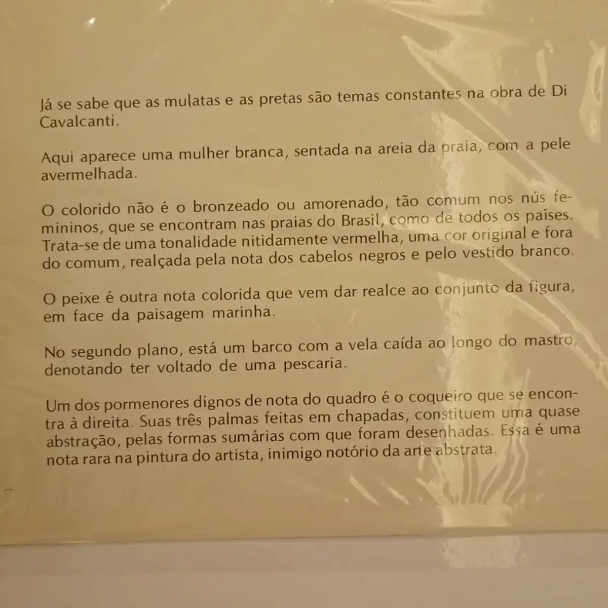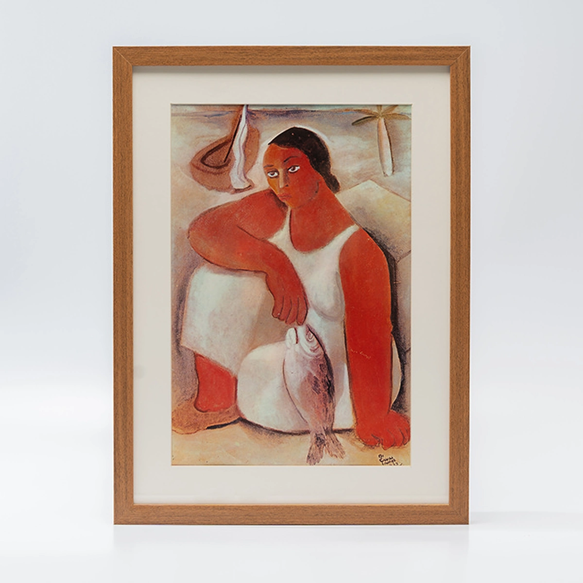 Figura central do modernismo brasileiro, Emiliano Di Cavalcanti (1897–1976) retratou o cotidiano popular em volumes generosos, curvas largas e cor quente. A imagem aqui reproduz uma composição de 1927 (óleo sobre cartão, 60 × 41 cm): mulher sentada na areia, vestido branco, pele avermelhada, cabelos negros. O peixe, nota cromática destacada, repousa no colo. Ao fundo, um barco com a vela caída sugere o retorno da pescaria; à direita, o coqueiro em três palmas chapadas roça a abstração — recurso raro no artista, conhecido pela aversão à arte abstrata.