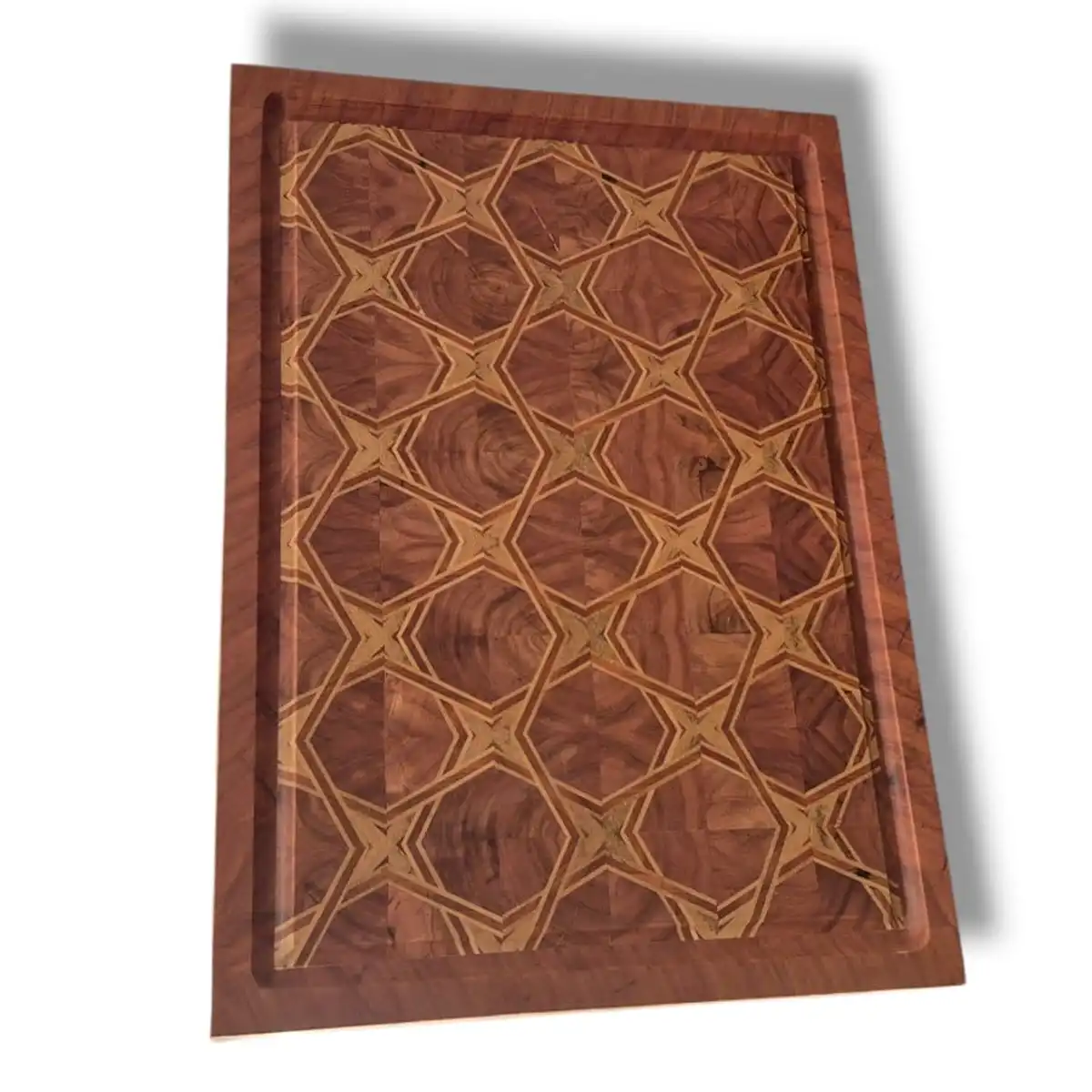 Esta tábua de churrasco é construída a partir de marchetaria geométrica, com um desenho contínuo e entrelaçado que se forma a partir do encaixe preciso de pequenos blocos de madeira. O padrão não é decorativo nem aplicado: ele nasce da própria construção da peça, bloco por bloco.