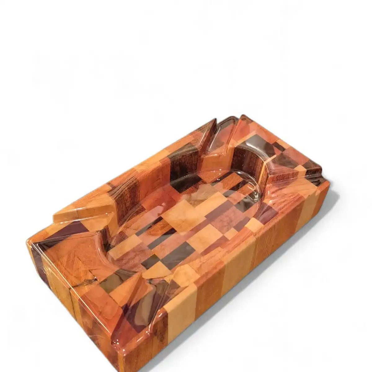 Este cinzeiro para charutos é construído a partir da mesma técnica de marchetaria aplicada às tábuas, com blocos de madeira maciça cuidadosamente cortados, orientados e encaixados para formar um conjunto sólido, preciso e visualmente equilibrado.